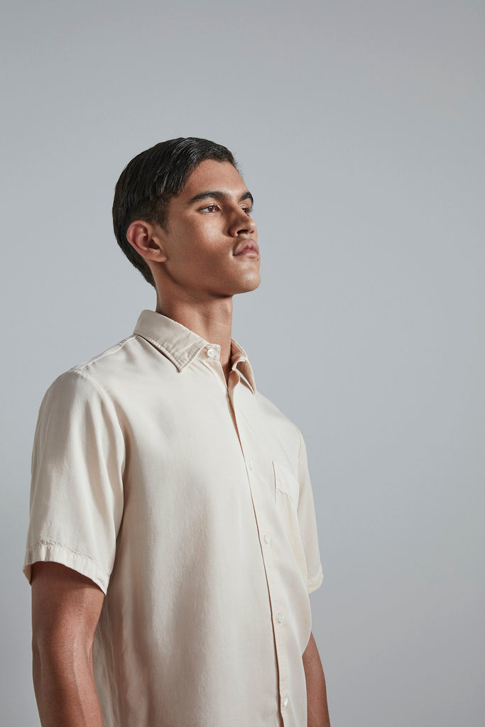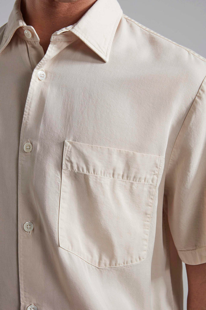 A classic shirt, cut in a straight silhouette with minimal detailing. Made in a smooth TENCEL™ Lyocell and garment-dyed, giving a faded patina to the garment.